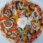 Base sauce tomate, fromage, aubergine, boeuf haché, oignons, poivrons et oeuf.